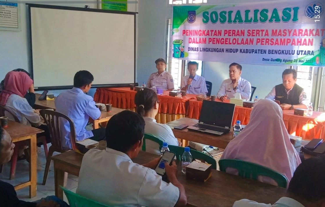 RZAPUBLIK.COM – Dinas Lingkungan Hidup Kabupaten Bengkulu Utara melalui Bidang Pengelolaan Sampah dan Limbah B3 mengadakan sosialisasi yang terpusat didesa gunung agung kecamatan kota argamakmur bengkulu utara, guna meningkatkan peran serta masyarakat dalam pengelolaan sampah.25 Oktober 2022.